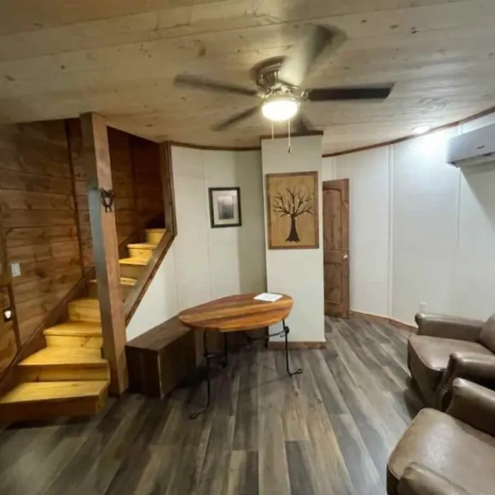 Inside, the home opens into a cozy circular living room that immediately highlights the uniqueness of the design. The space feels warm and inviting, with comfortable seating arranged to create a relaxing atmosphere. A flat-screen television is mounted above a striking stone-framed gas fireplace, giving the room both style and function.