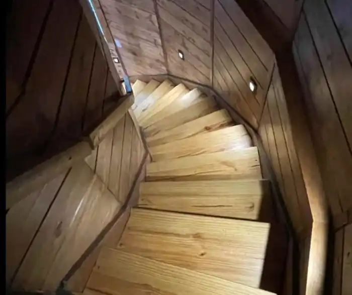 One of the most eye-catching features of the home is the spiral staircase that connects each level. Reaching the upper floors becomes part of the experience itself. To get to the fourth-floor master bedroom, guests climb 45 winding steps, enjoying the unusual architecture along the way.